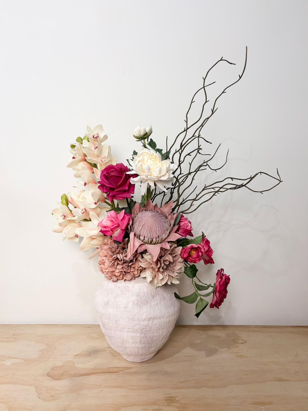 A modern, sculptural arrangement designed to celebrate her. Featuring soft blush tones, rich pink accents, and a striking protea at its heart, this piece blends delicate florals with natural branching for a look that feels both refined and organic. A beautiful statement for Mother’s Day, made to last well beyond the moment.