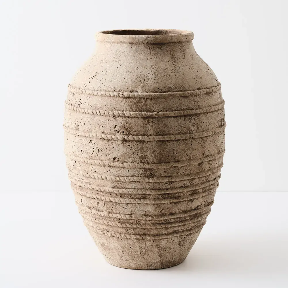 Sotka Pot - A rustic, earthy pot featuring natural imperfections and distinctive rope-like detailing around its body. Perfect for styling with large stems, showcasing solo, or nesting with others to create a warm, textured Mediterranean-inspired look.