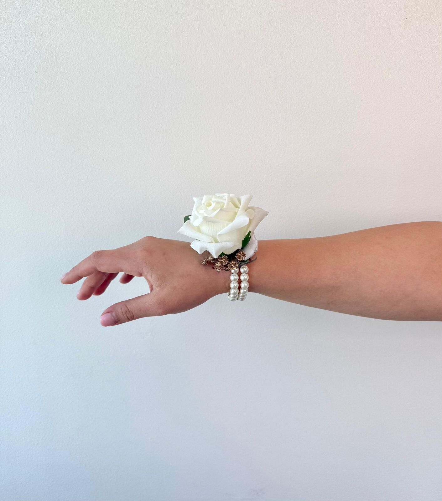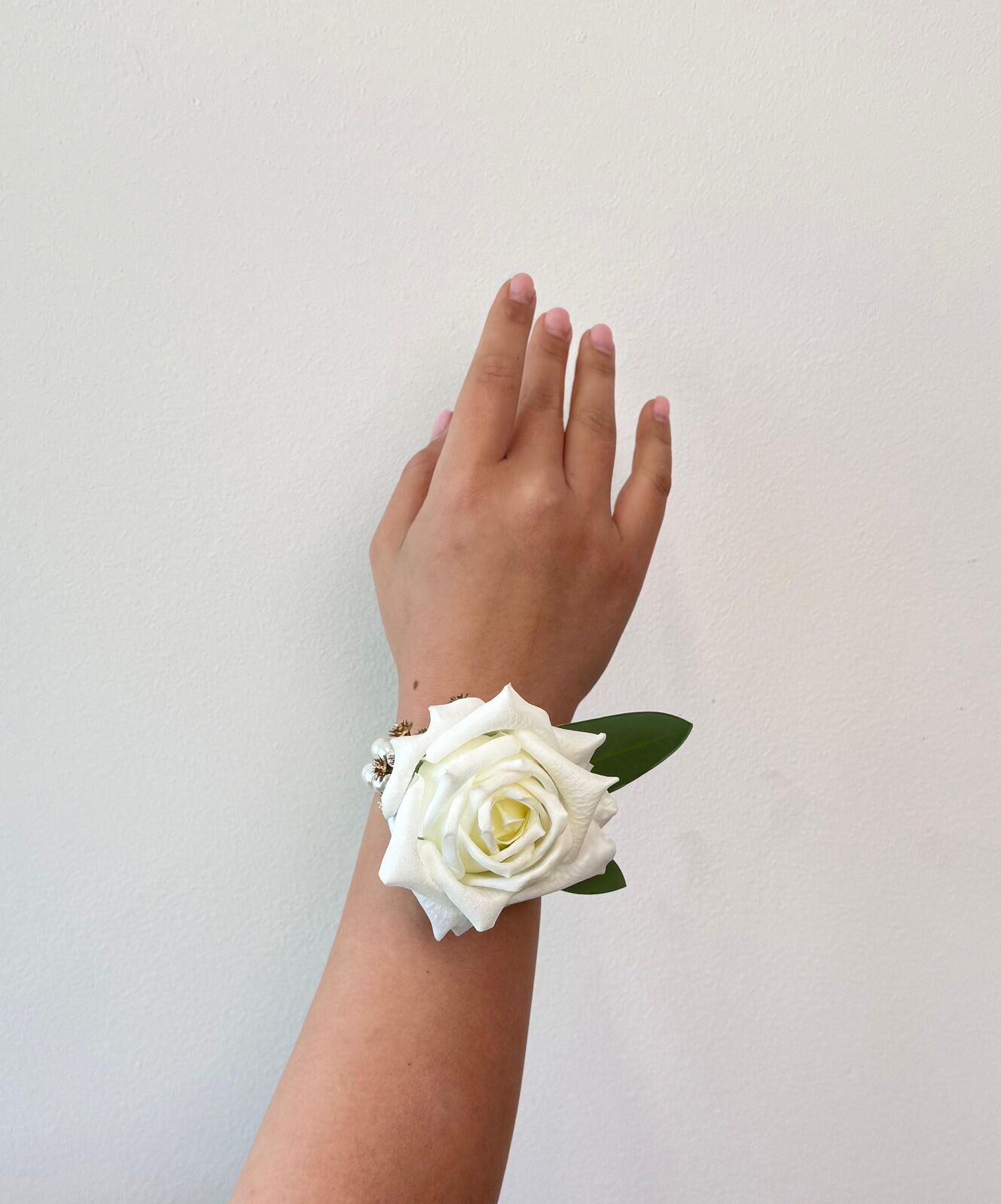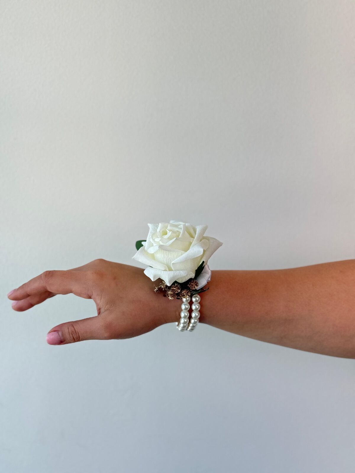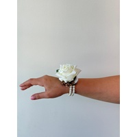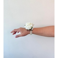 A timeless accessory for formal occasions, this corsage features our Lucey white rose accented with our real touch eucalyptus and a pearl-beaded elastic band for a comfortable fit. Perfect for weddings, school formals, or special events, it adds a touch of classic elegance to any outfit.